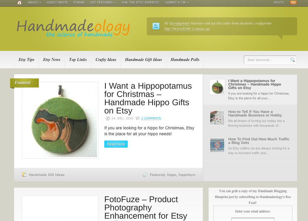 I just joined a new website for handmade artists - Handmadeology.com - the science of handmade. They have great resources for your Etsy store and your handmade business, as well as inspiration and ideas. By signing up to their RSS feed, you can get a free copy of "Handmade Blogging Blueprint", a guide to help boost your blog. Come take a look!